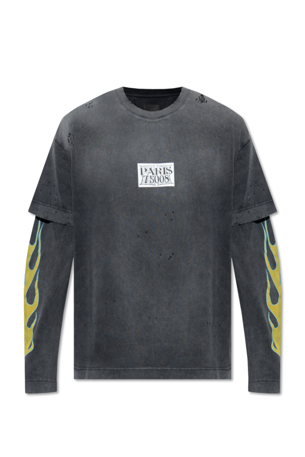 Dark grey crewneck T-shirt from Givenchy. Made from washed cotton with distressed details, this style features graphic prints, ribbing on the collar and double-finished long sleeves with printed flames.