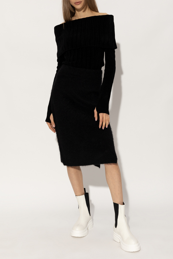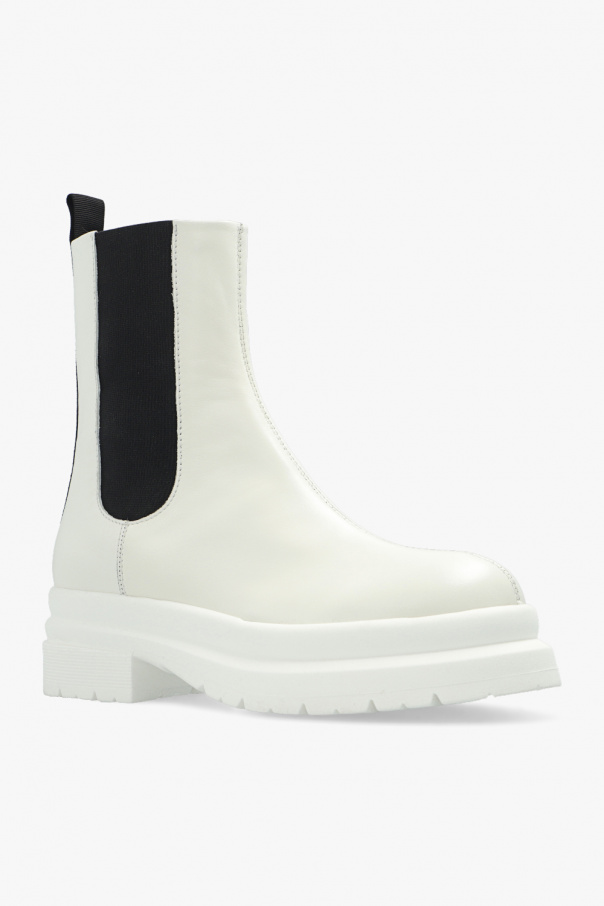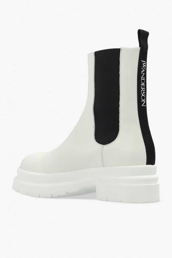 White and black Chelsea boots from JW Anderson. Crafted from smooth leather, this model sits on a white rubber sole and features elastic panels on the sides and a black fabric insert with a printed white logo at the back.