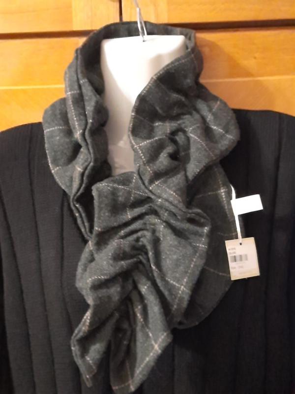 Шарф двухслойный.По середине прошита резинка , длина по середине 80 см..