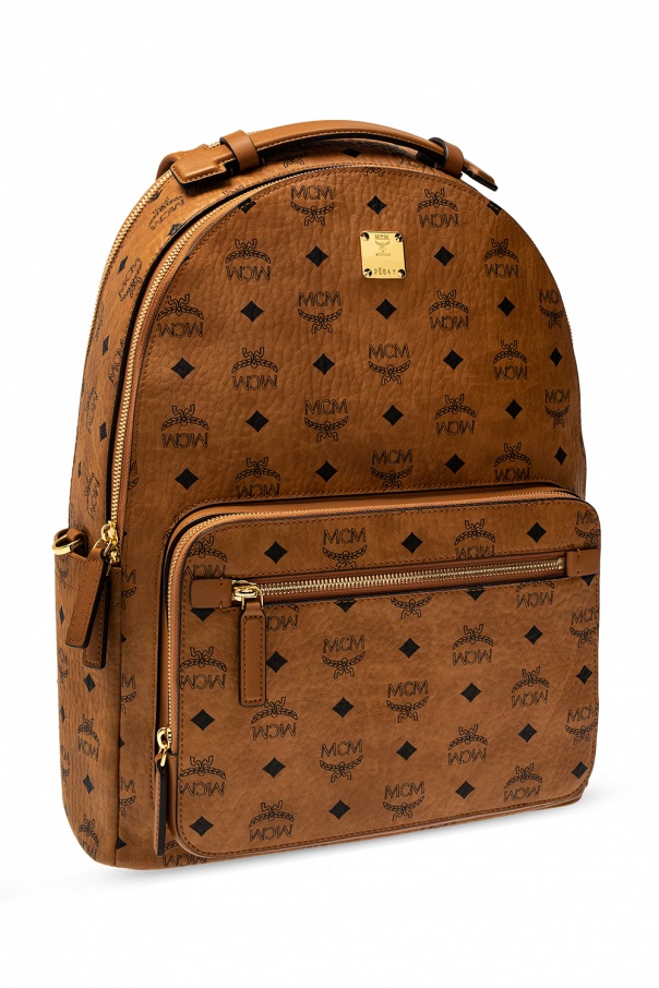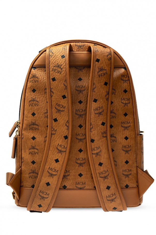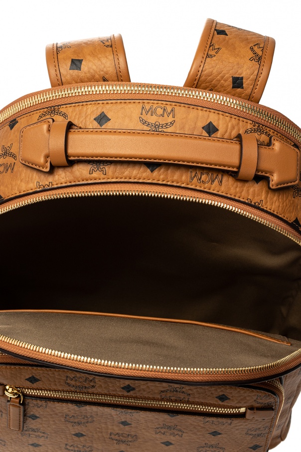 Brown backpack from MCM. Crafted from the brand\'s signature Visetos canvas, this design features a printed pattern in black, logo detail, zip fastening, two front zip pockets, two side slip pockets, adjustable shoulder straps and gold-tone metal hardware. It has two compartments, one slip pocket and two partitions inside.