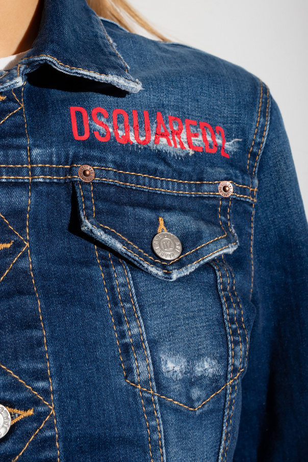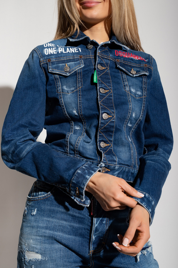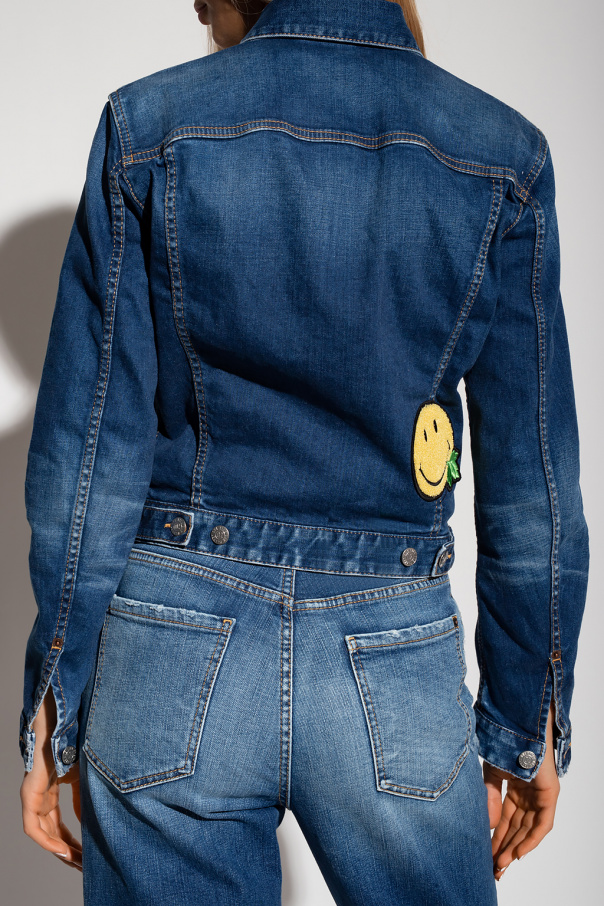 Navy denim jacket from Dsquared2 x Smiley®, the ‘One Life One Planet’ collection. Made of cotton, this garment features a pattern with a worn effect, white and red logo print and long sleeves with banded cuffs.