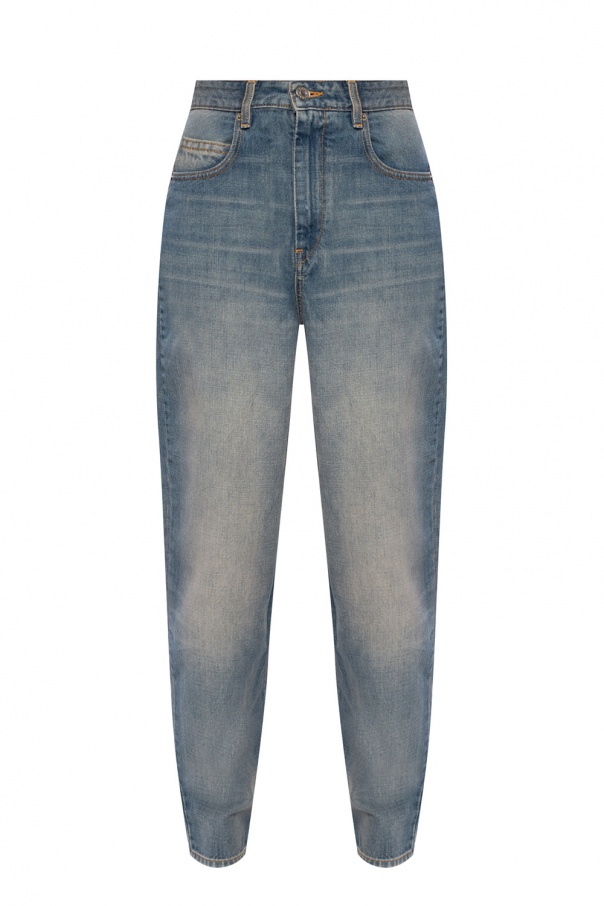 Blue jeans from Isabel Marant Étoile. Fastened with a zip and a button, this flared leg design features yellow stitching details, embroidered lettering, three front pockets and two rear pockets.