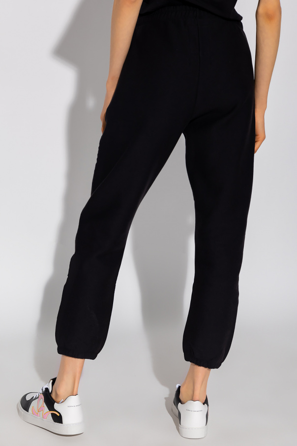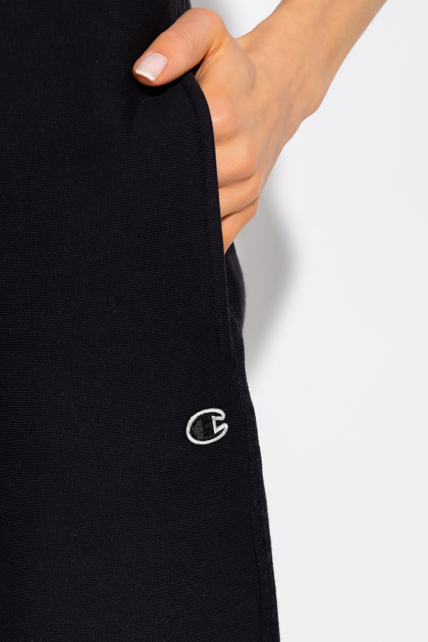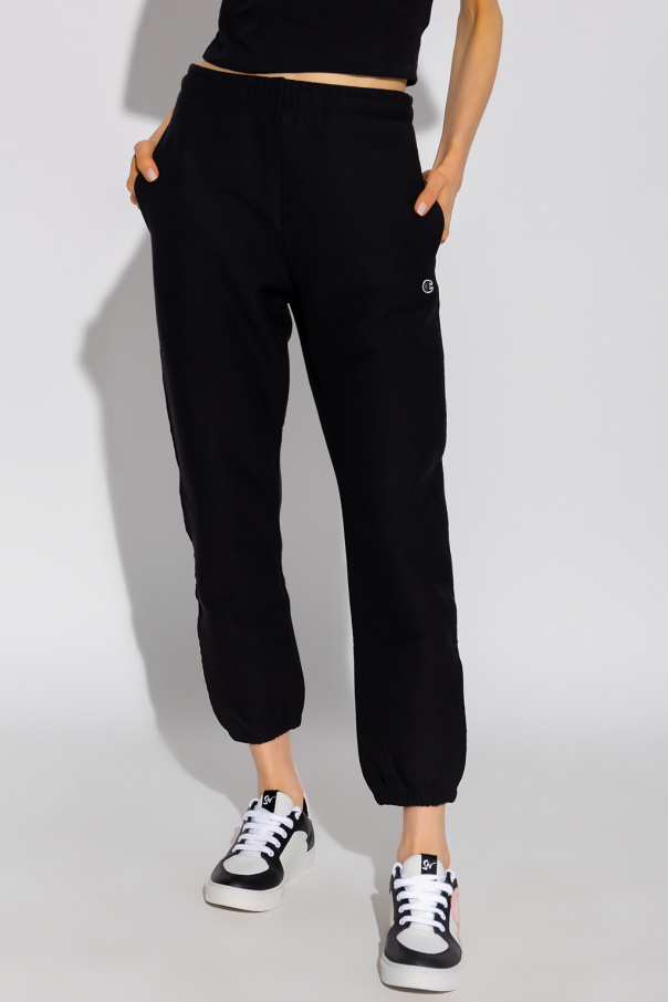 Black sweatpants from Champion. crafted from cotton, this pair features a drawstring waistband, elasticated cuffs, two slip pockets and a logo patch for brand recognition.