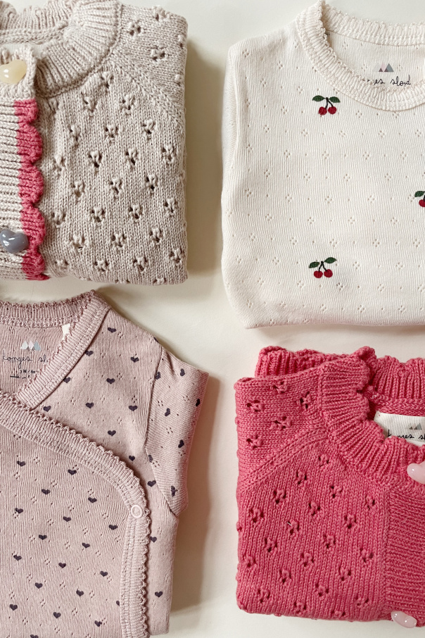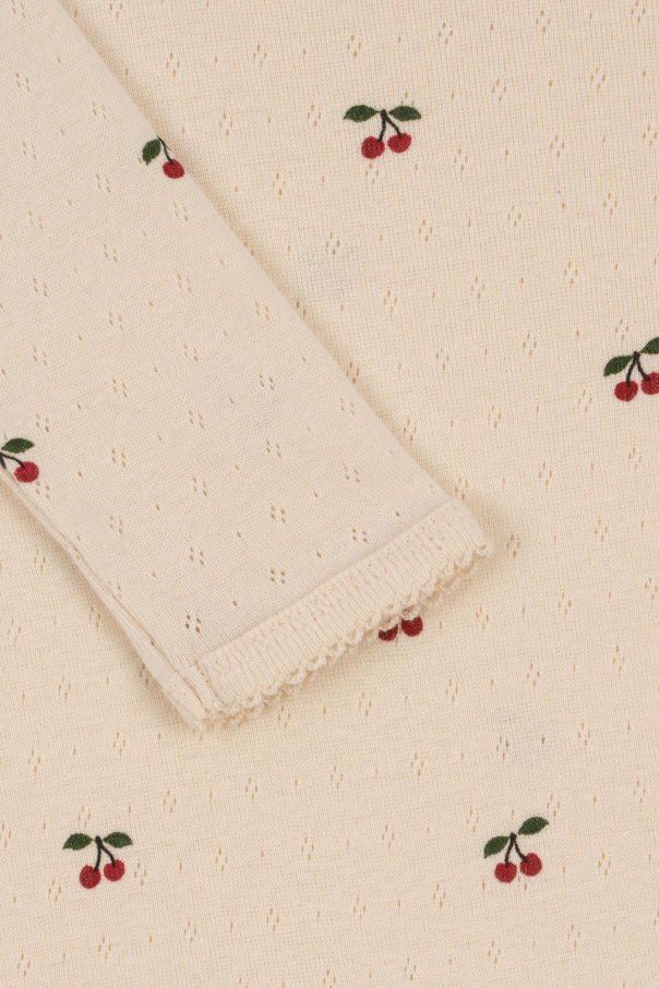 Cream jumpsuit from Konges Slojd. Crafted from organic cotton, this item features a cherry motif, snap fastenings at the bottom and lace trims on the round neck, long legs and sleeves.