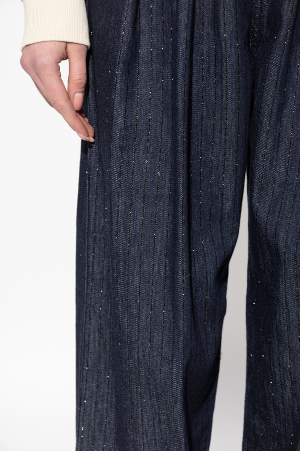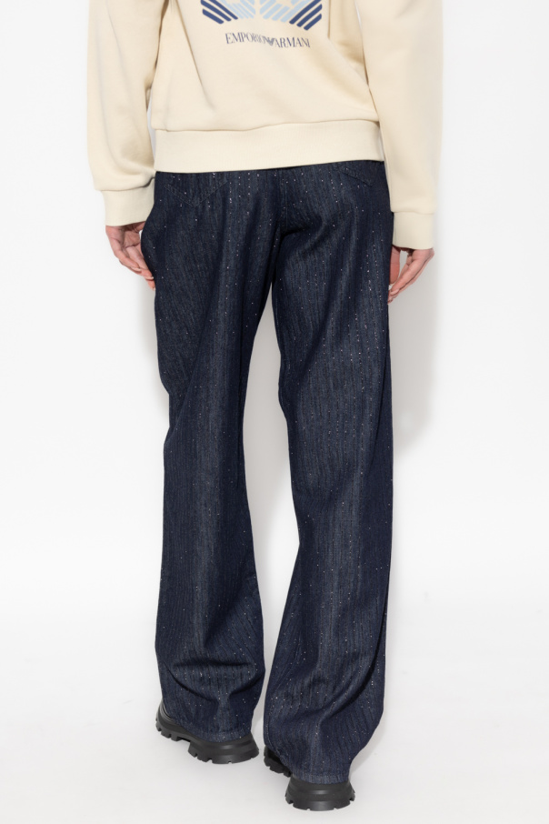 Navy jeans with pleat details from Emporio Armani. Fastened with a zip and button, this wide leg design features four slip pockets and stripe pattern inlaid with lurex threads.