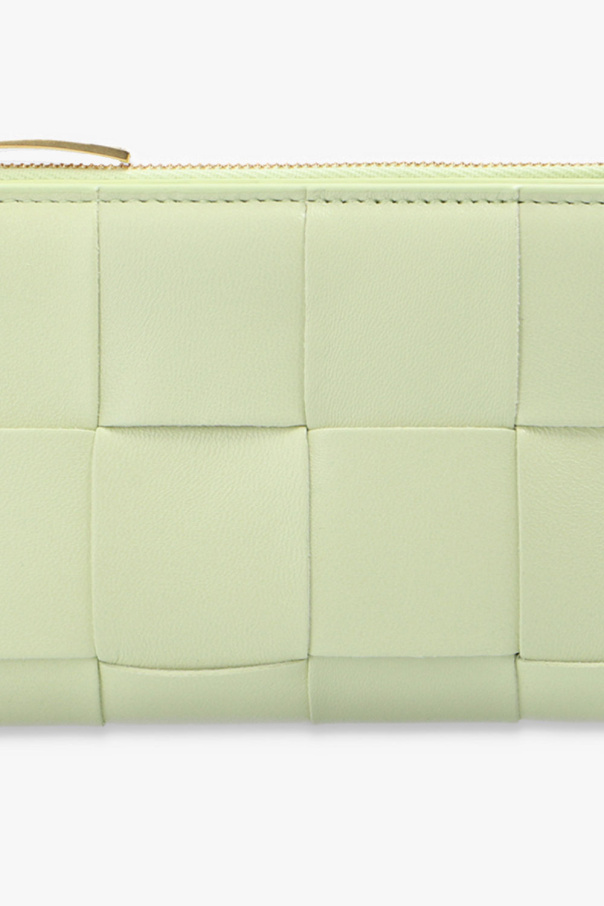 Light green wallet from Bottega Veneta. Made of lamb and calf leather with the label’s signature Intrecciato weave, this model features a snap fastening, back zip pocket and gold-tone metal hardware. It has a bill compartment, four slip pockets and ten card slots inside.
