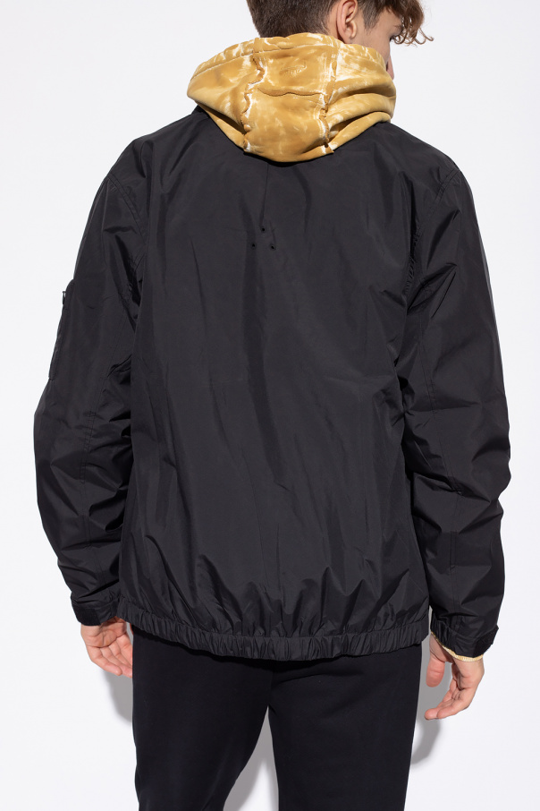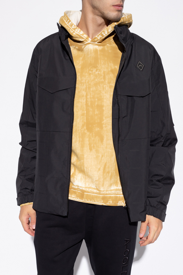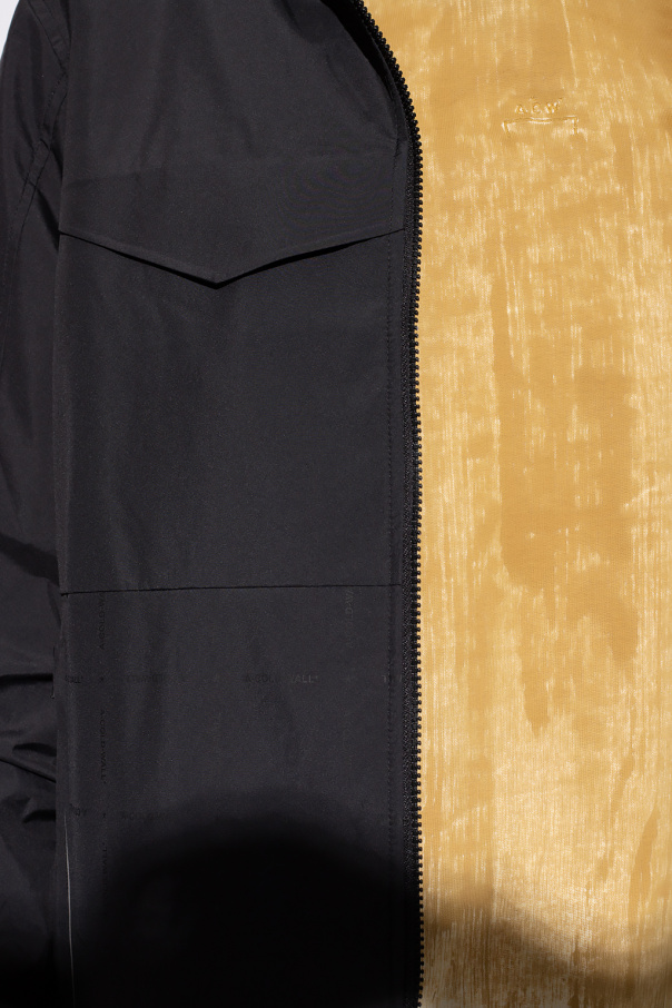 Black rain jacket from A Cold Wall. Enriched by a black and silver-tone raised logo appliqué, this style features a two-way zipper, velcro closures, two zipped pockets, long sleeves with elasticated cuffs and a hood concealed in the collar.