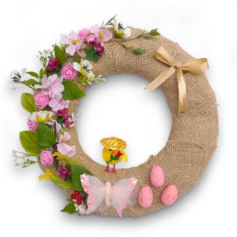 Основа венка — мешковина. Украшен веточкой сакуры, яблоневым цветом, розами, зеленью — символ жизни на земле. Яйца - это зарождение новой жизни, а маленький цыпленок и есть сама жизнь.Состояние: НовоеЦвет:- Разноцветный