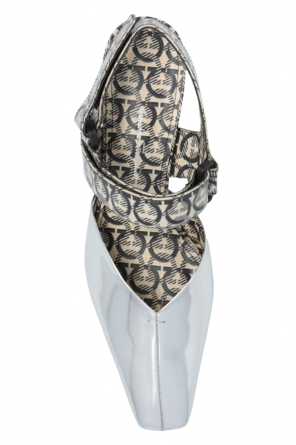 Silver-tone ‘Sagar’ pumps from Salvatore Ferragamo. Resting on a black rubber sole, this square toe design features an elastic heel strap with a beige and black logo print as well as a decorative asymmetric heel.