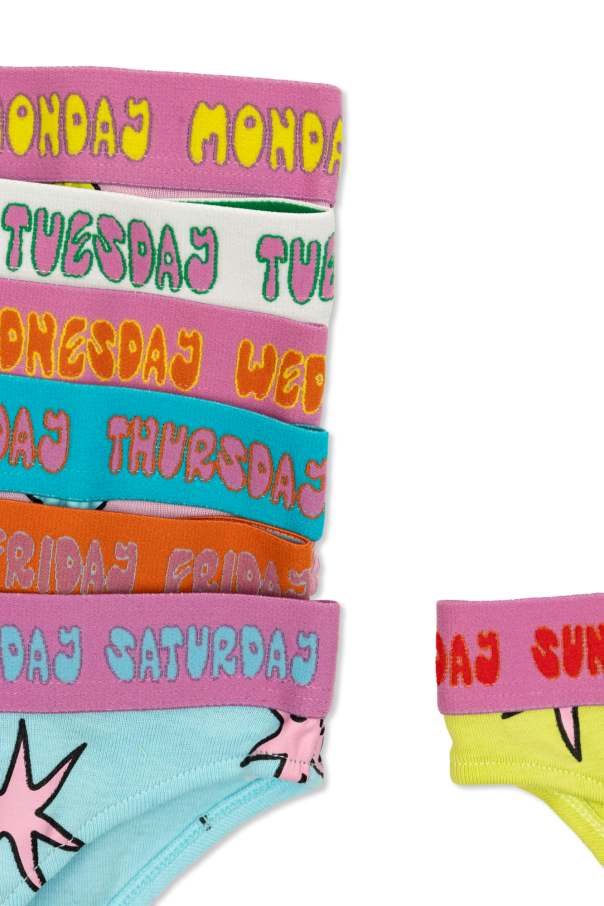 Introducing the Siedmiopak Majtek from the distinguished Stella McCartney Kids collection. This exclusive set features seven pairs of children\'s underwear, each adorned with the colorful names of the days of the week on a soft, elastic waistband. The playful star patterns further enhance the whimsical charm of each piece. Crafted from a luxurious blend of cotton and elastane, these briefs offer unparalleled comfort and flexibility for everyday wear. The multicolor design ensures a vibrant and joyful addition to any child\'s wardrobe. Each pair is meticulously packaged in an elegant yellow box, complete with delightful graphics and the iconic Stella McCartney Kids logo, underscoring the premium nature of this product. Why Choose This Product? High-Quality Materials: Soft and stretchy blend of cotton and elastane for maximum comfort. Unique Design: Colorful days of the week printed on the waistband and playful star patterns. Exclusive Packaging: Comes in an elegant yellow box with fun graphics and designer logo. Renowned Designer: From Stella McCartney Kids, celebrated for their exquisite children\'s fashion.
