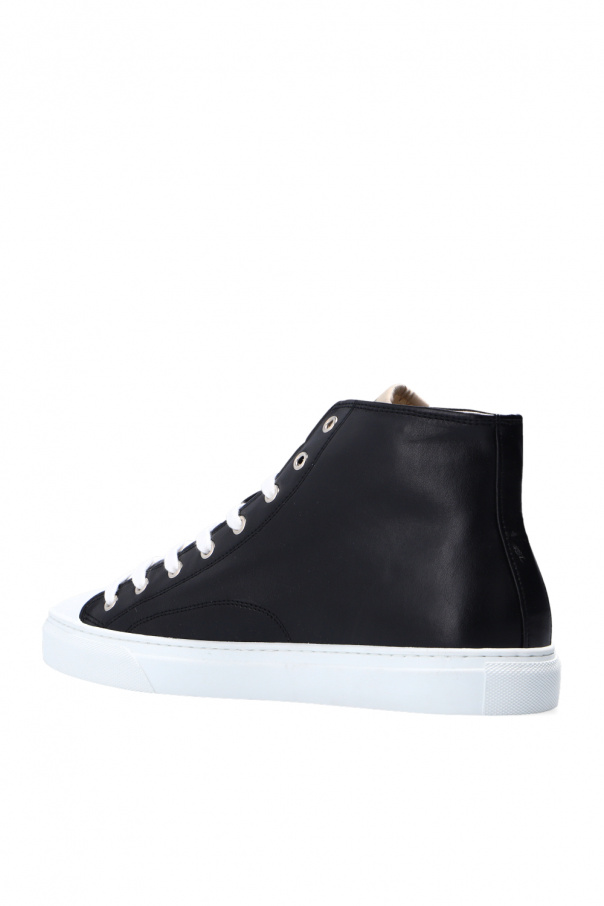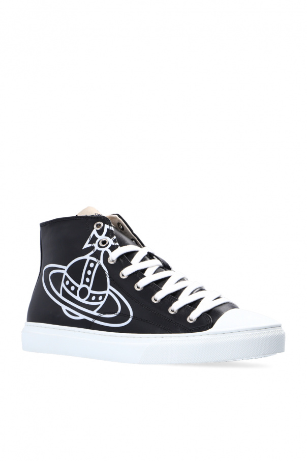 Black sneakers from Vivienne Westwood. Made of vegan leather, this lace-up pair is decorated with a printed logo pattern in white and rests on a white rubber sole.