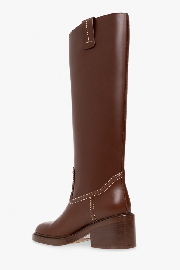 Brown ‘Mallo’ heeled boots from Chloe. Crafted from calf leather, this model sits on a brown sole in rubber and leather and features distinctive topstitched detailing.