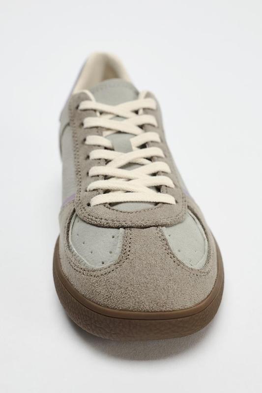 Кроссовки со шнурками, контрастным задником и боковыми вставками.