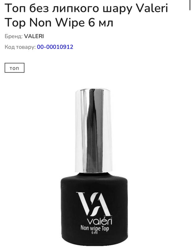 Блискучий ефект: Топ Valeri Top Non Wipe забезпечує глибокий і блискучий ефект, який зберігається протягом тривалого часу.