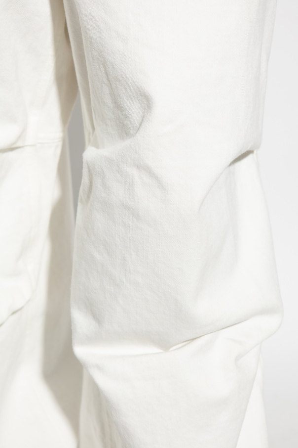 White trousers from JIL SANDER. Made of cotton with a relaxed fit, this pair falls with wide legs and features an adjustable waistband, a zip fly with snaps and four flapped pockets with snaps.
