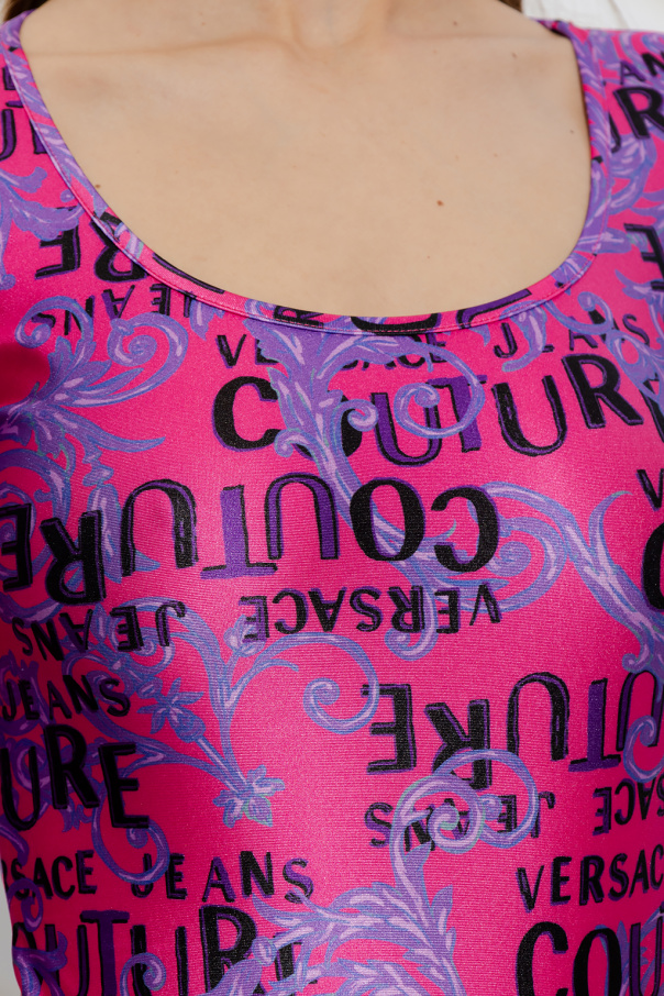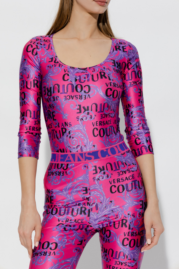 Pink, purple and black body from Versace Jeans Couture. Fastened with hooks, this design features a Logo Couture pattern, round neck with decorative trimming and 3/4 length sleeves.