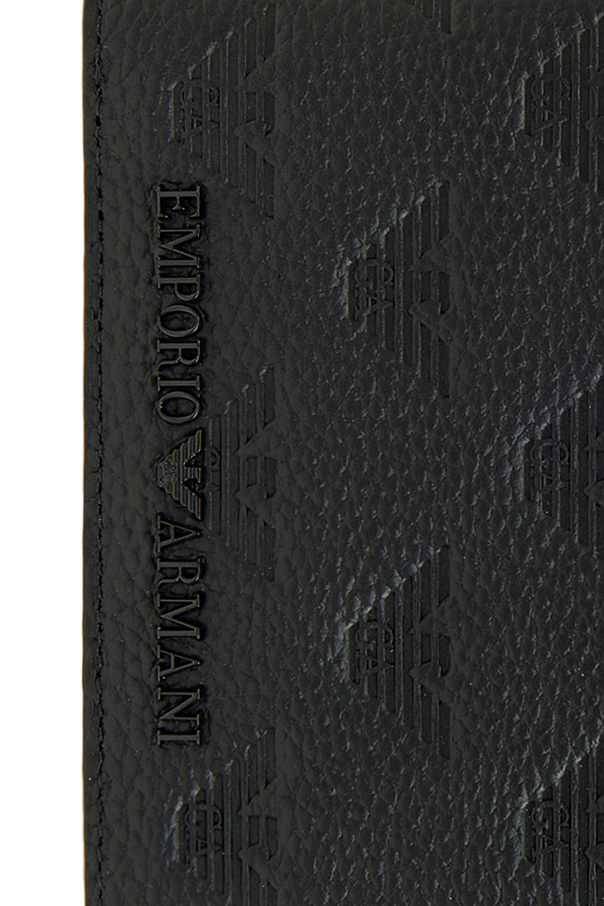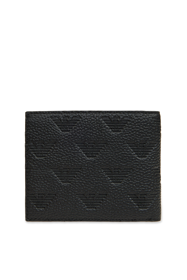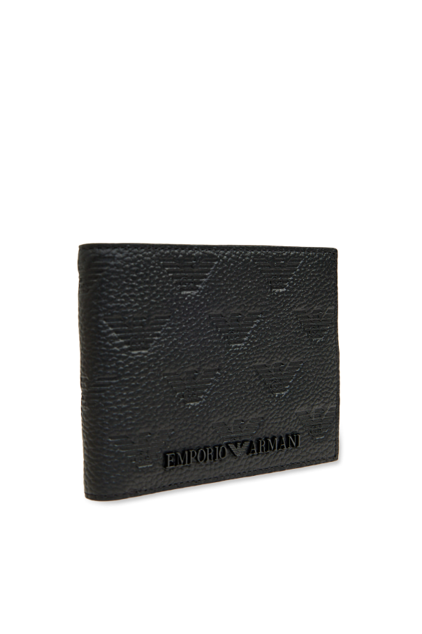 Black folding wallet from Emporio Armani. Made of leather, this item is embellished with a metal logo plaque and an embossed logo and features two bill compartments, four slip pockets and eight card slots inside.