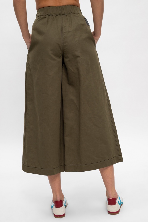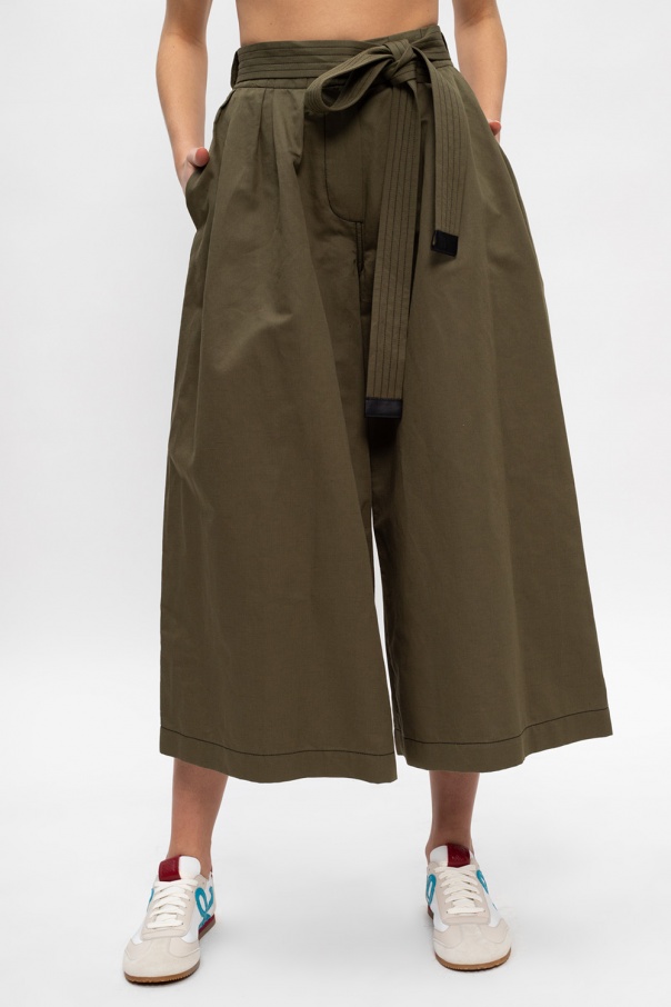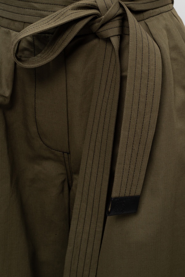 Green trousers from Loewe. Cut from cotton and linen, this pair falls down with wide legs and employs a zip fly, hook and button fastenings, two side seam pockets, a self-tie belt and a black Anagram embossed patch on the back.