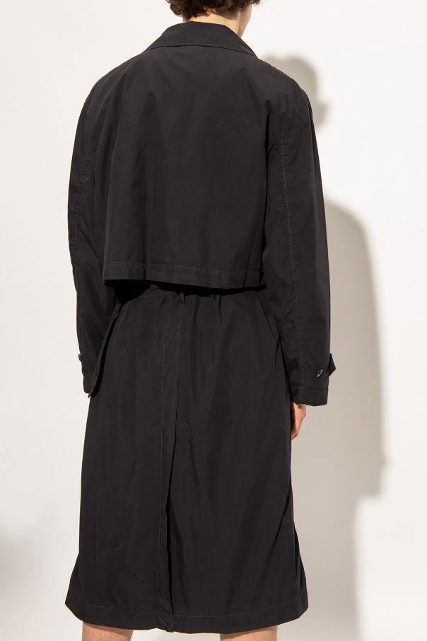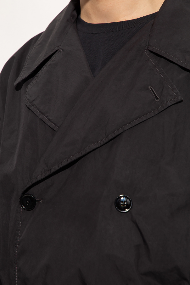 Black double-breasted trench coat from Lemaire. Made of cotton, this garment features a belt, two buttoned pockets and a slit at the back.