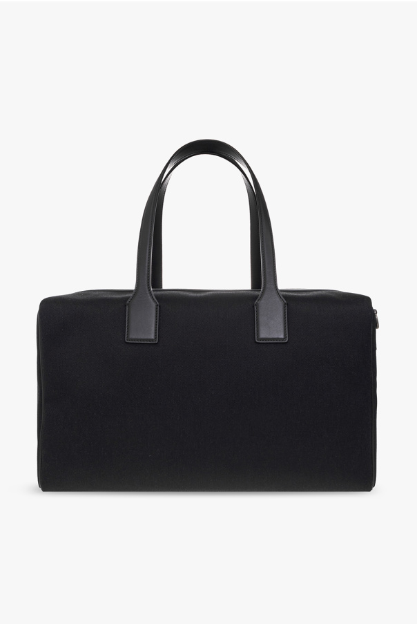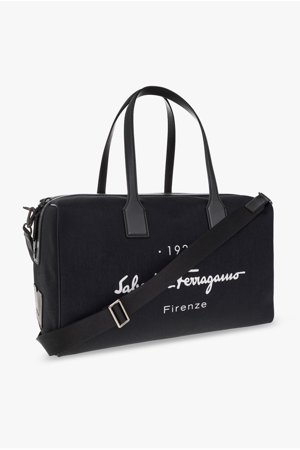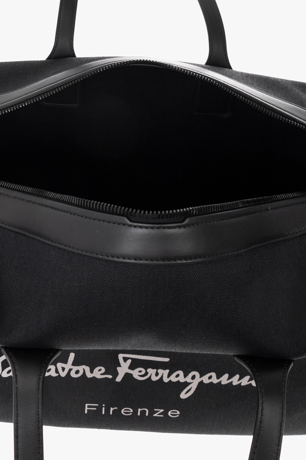 Black holdall bag from FERRAGAMO. Made of fabric and leather, this design features a zip fastening, two half-round handles, shoulder strap, logo print, one internal compartment and black metal hardware.