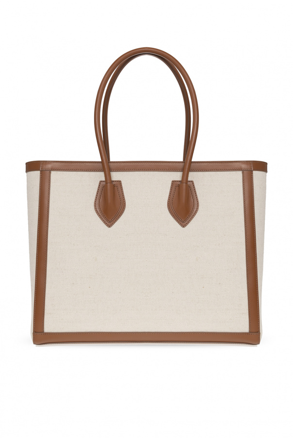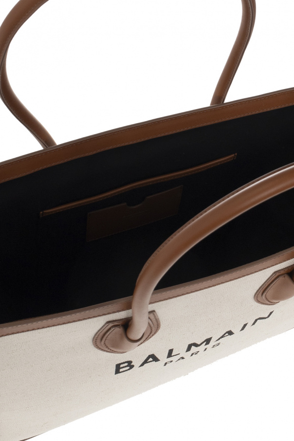 Cream and brown ‘B-Army 42’ shopper bag from Balmain. Made of a cotton and linen blend, this model features calf leather trims, black logo print, two half-round handles, gold-tone metal hardware and one internal compartment with one slip pocket and one card slot.