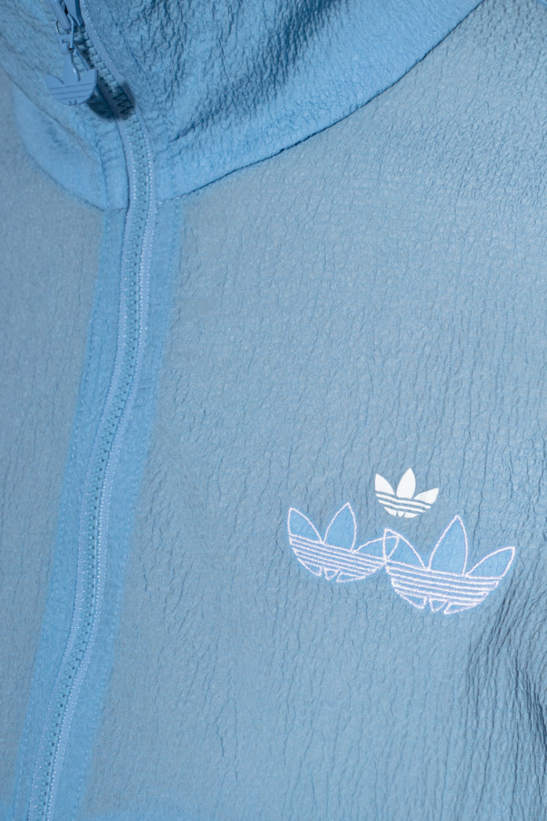 Light blue windbreaker from ADIDAS Originals. Crafted from recycled material with a texture, this style features a zipper, two welt pockets, elasticated trims and a white graphic print and embroidery with the brand's logo.