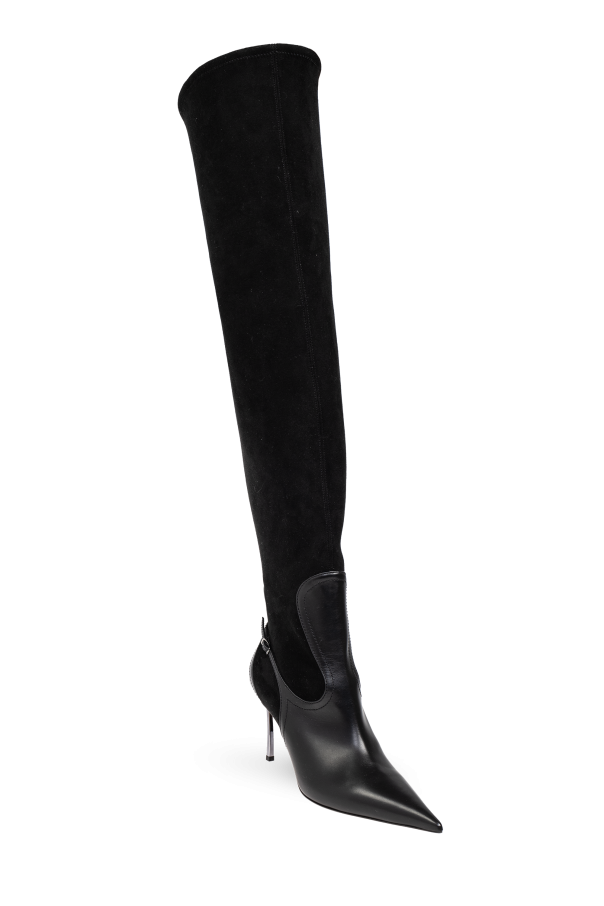 Introducing the exclusive Love Over-the-Knee Boots by the renowned designer Casadei. These boots epitomize sophistication and elegance, making them an impeccable choice for any refined wardrobe. Meticulously crafted, the upper part of these boots is made from soft, black suede, while the lower part, including the pointed toe and stiletto heel, is constructed from smooth, black leather. This harmonious combination of materials ensures both comfort and durability, enhancing the overall luxurious feel. Featuring a sleek, over-the-knee design, these boots boast a high, slender stiletto heel that elongates the silhouette, adding a touch of glamour to any ensemble. The minimalist aesthetic, free from visible embellishments or logos, underscores their exclusive and timeless appeal. The boots are equipped with an inner zipper, facilitating effortless wear and removal. Perfectly paired with elegant long dresses, as seen in the accompanying images, they offer unparalleled versatility in styling for special occasions. Why Choose This Product? Exquisite blend of black suede and leather for a luxurious look and feel. Over-the-knee design with a pointed toe for a sleek, sophisticated appearance. High stiletto heel that enhances posture and silhouette. Minimalist and timeless design, free from unnecessary embellishments. Inner zipper for easy wear and removal.