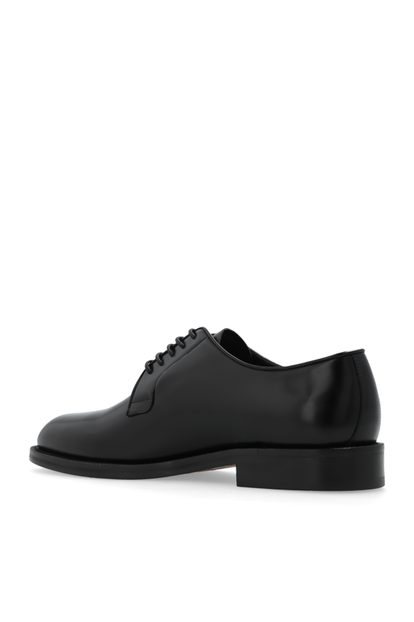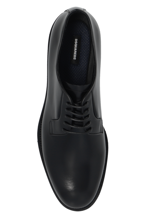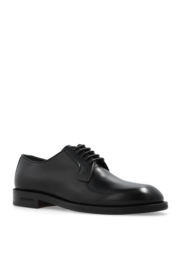 Black derby shoes from Dsquared2. Made of leather, this lace-up pair features an embossed logo on the side and rubber-trimmed rubber sole in brown and black.