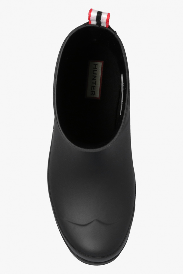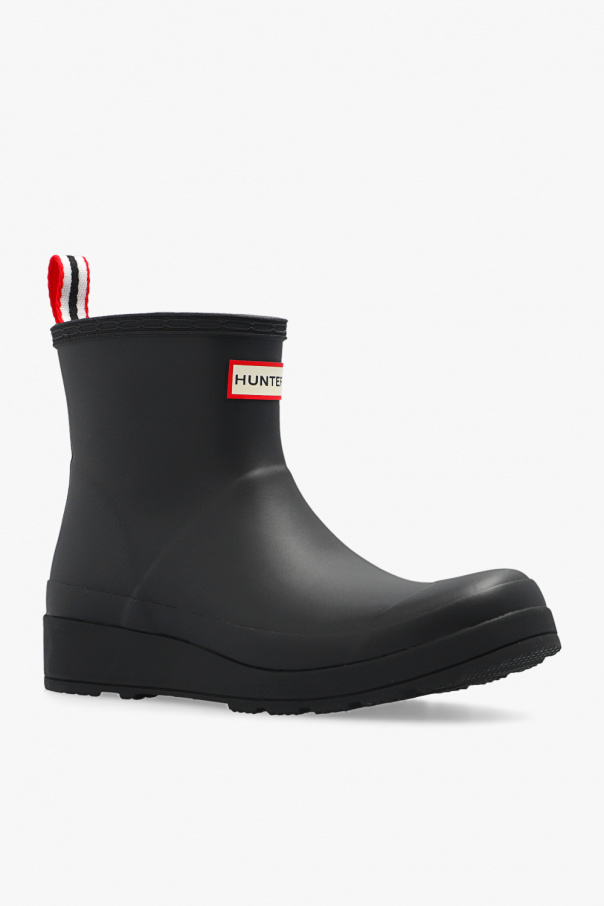 Black ‘Play Short’ rain boots from Hunter. Handcrafted from natural vulcanised rubber, this pair features a logo appliqué, fabric pull strap in white, red and navy as well as a rubber outsole with Hunter Original tread pattern.