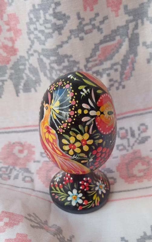 Пасхальне дерев'яне яйце "Пташка", ручний розпис. Петриківський розпис. Дерево липа, акрилові фарби, гуаш, глянцевий лак. Висота з ніжкою 9,5 см, яйце 7см.