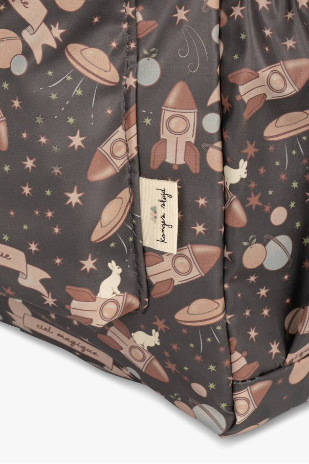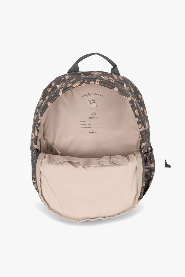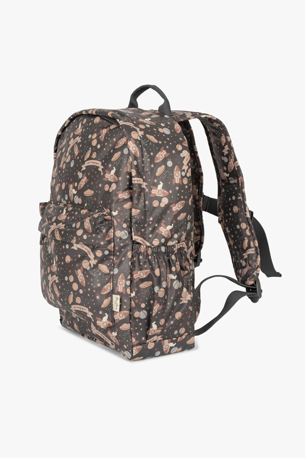 Navy backpack from Konges Slojd. Made of fabric with the OEKO-TEX® certificate and a BIONIC-FINISH® ECO coating. Fastened with a two-way zip, this model features a multicolored pattern, front zip pocket, side pocket, top handle, adjustable buckled shoulder straps and one internal compartment with one slip pocket and two pen holders.