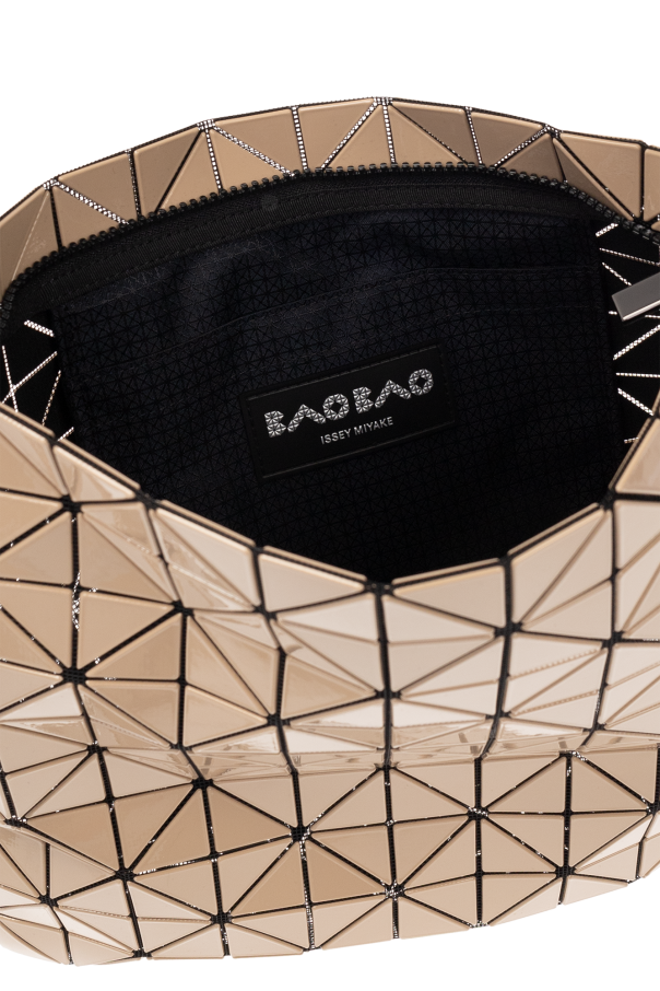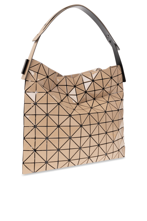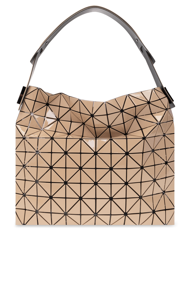 Beige and black shopper bag from Bao Bao Issey Miyake. Decorated with geometric inserts, this model features a shoulder strap, black metal hardware and one internal compartment with one slip pocket.