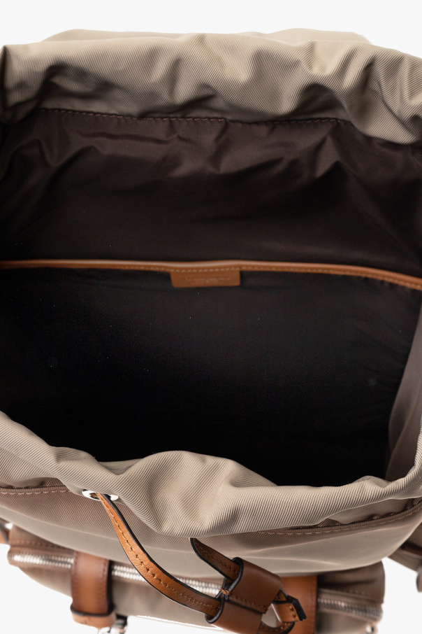 Khaki backpack from Giorgio Armani. Fastened with snap buttons, this garment features a logo-embossed patch, half-round handle, adjustable shoulder straps, three zip pockets, one internal compartment and silver-tone metal hardware.