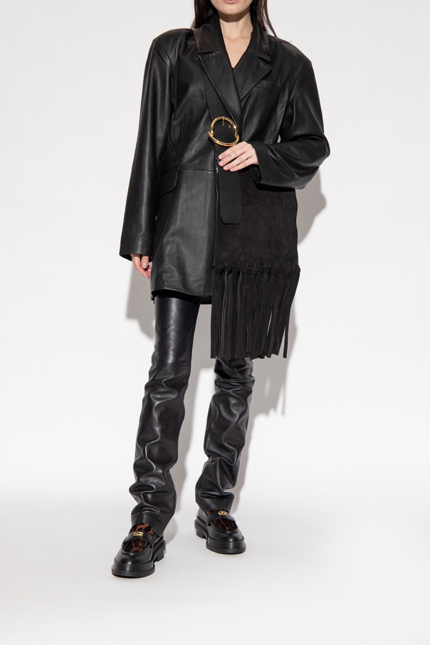 Black ‘Mallick’ loafers from Giuseppe Zanotti. Crafted from leather with velvet trims decorated with a brown and black animal pattern, this pair features a gold-tone metal GZ appliqué and black rubber sole.