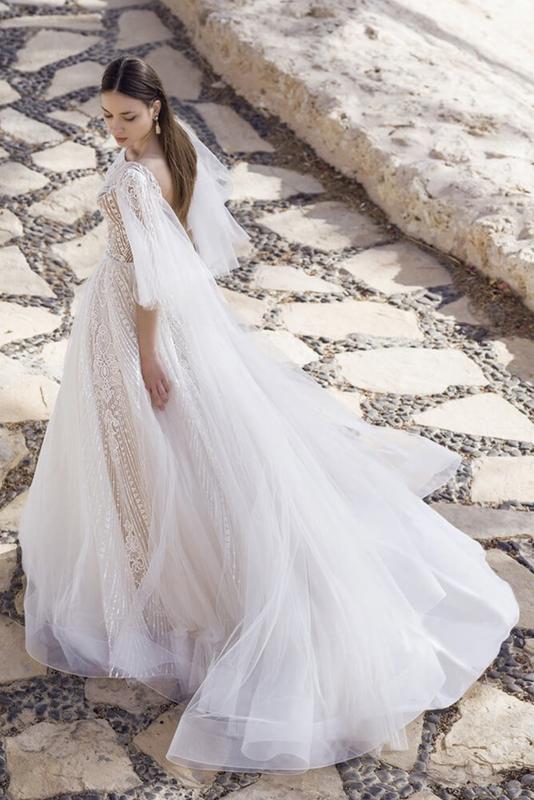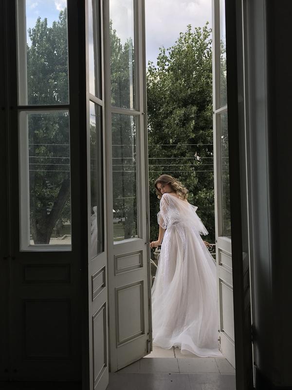 Легка сукня в кольорі айворі з мерехтливого мережива з широкими зйомними рукавами. Корсет м’який, без чашок. Спинка відкрита, застібка на замок. Спідниця багатошарова, але повітряна, по низу обробка регіліном. Невеликий шлейф 25 см. Одягнута на зріст 170 см, параметри 84/65/92. Сукня після хімчистки, стан ідеал, торг можливий.
