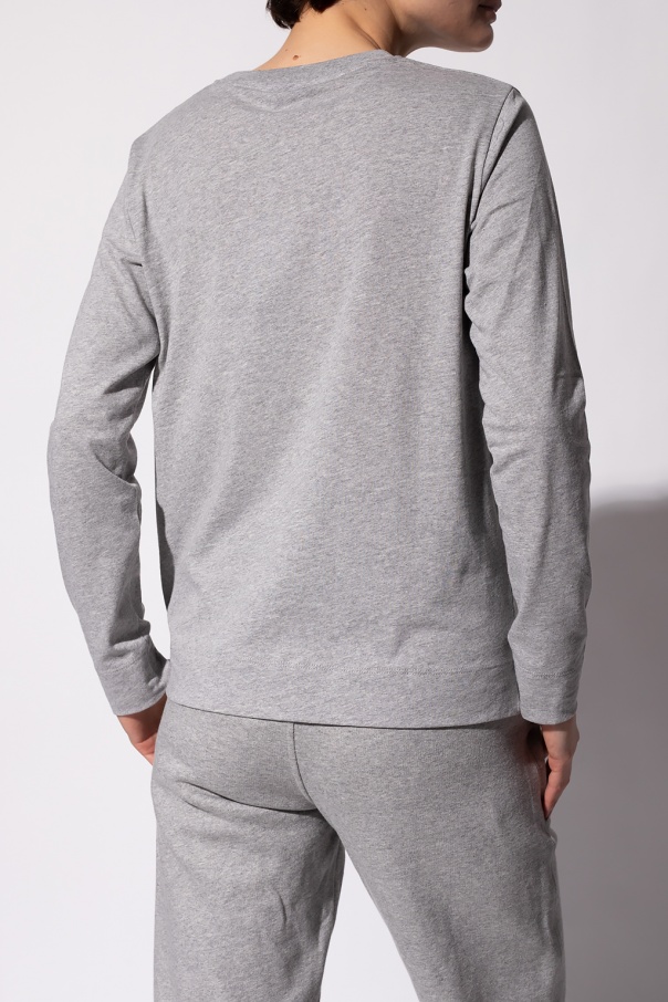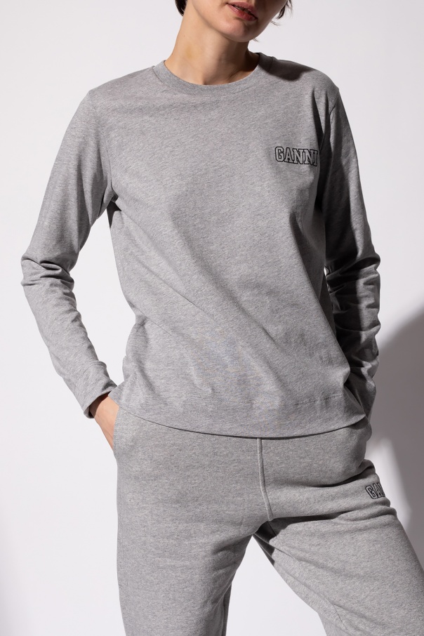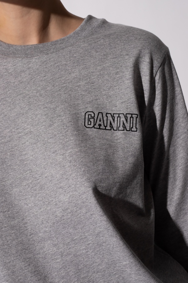 Grey T-shirt from Ganni. Crafted from certified recycled EcoLife® yarn, this long-sleeved design features a printed logo pattern in black, ribbed round neck and slits at the hem. EcoLife® is made from 50% post-consumer recycled polyester, such as PET plastic bottles, and 50% pre-consumer recycled cotton from end-of-line manufacturing scraps that would otherwise go to waste.