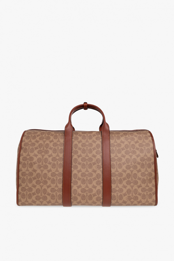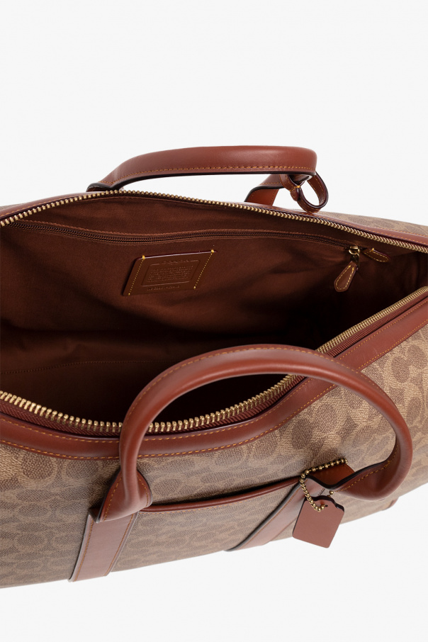 Brown and beige ‘Gotham‘ holdall bag from Coach. Crafted from the brand’s signature coated canvas with a monogram and calf leather trims, this design features a two-way zip, detachable logo-embossed keyring, two half-round handles, detachable and adjustable shoulder strap, gold-tone metal hardware and one internal compartment with three slip pockets and one zip pocket.
