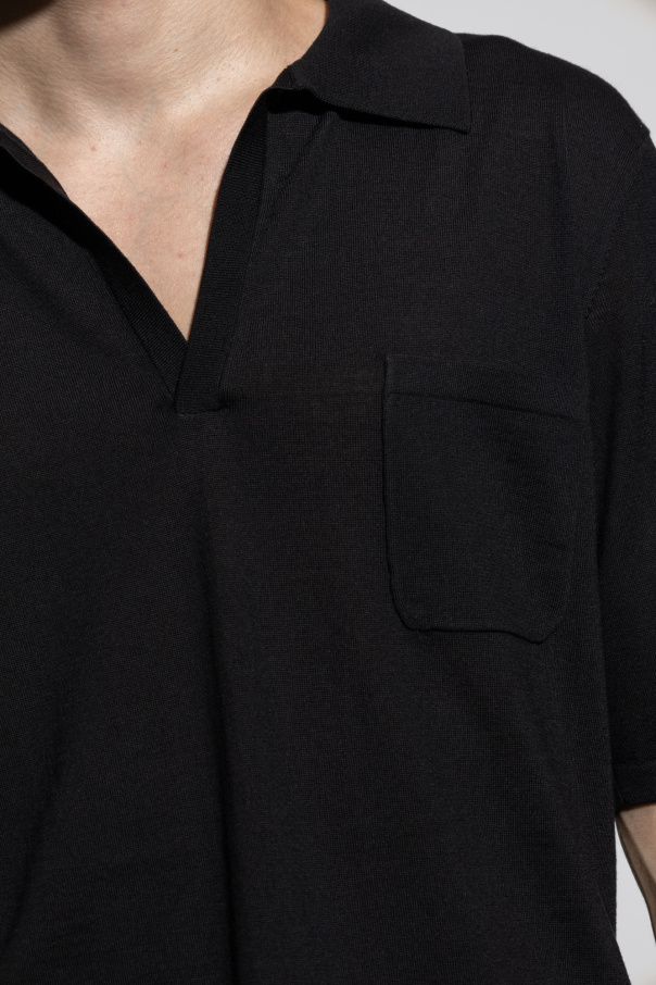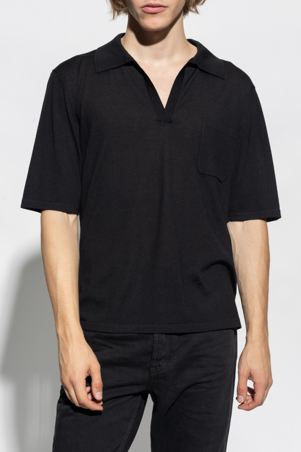 Black polo shirt with a collar, front pocket and short sleeves from Saint Laurent. Made of wool.