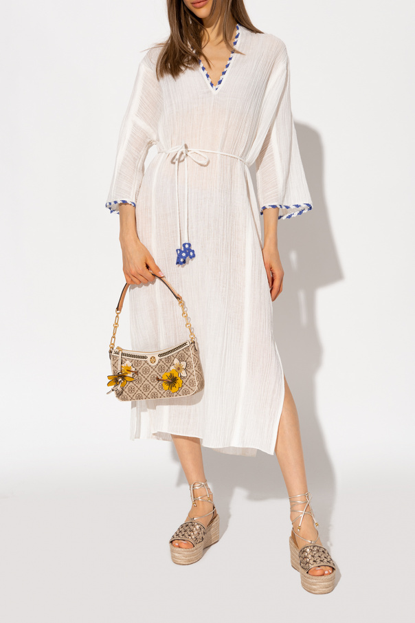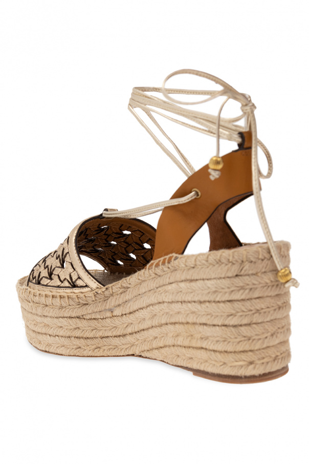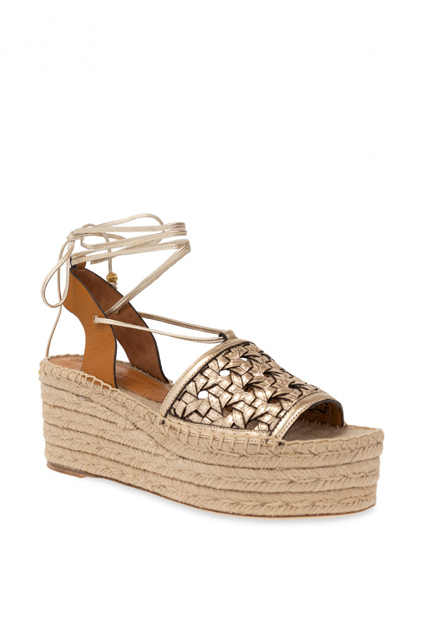 Gold-tone and brown ‘Basketweave’ platform sandals from Tory Burch. This design features a Vachetta leather upper with a metallic finish, ankle ties, decorative weave and sole made of woven jute and rubber in beige.