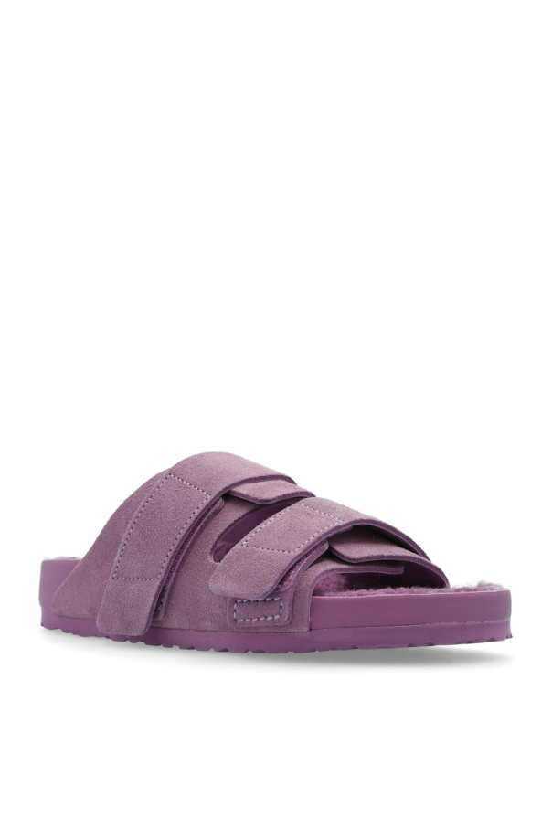Purple ‘Uji Handstitch’ slides from Birkenstock x Tekla. Made of suede and lined with sheep fur, this model sits on a purple EVA foam outsole and features an embossed logo, velcro closures and an anatomically shaped cork-latex footbed with standard width.