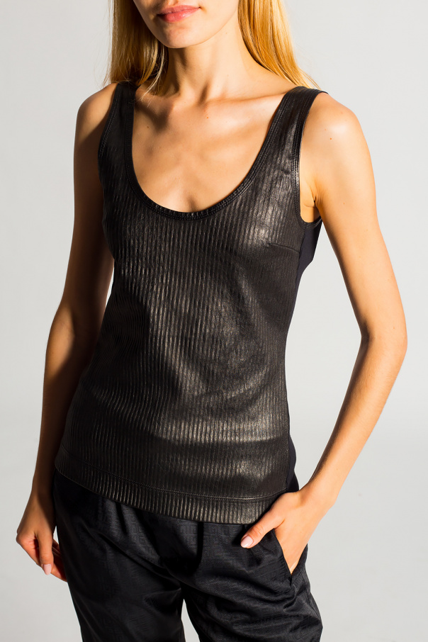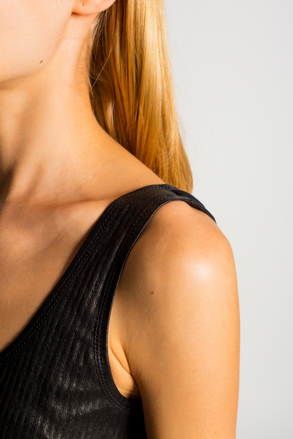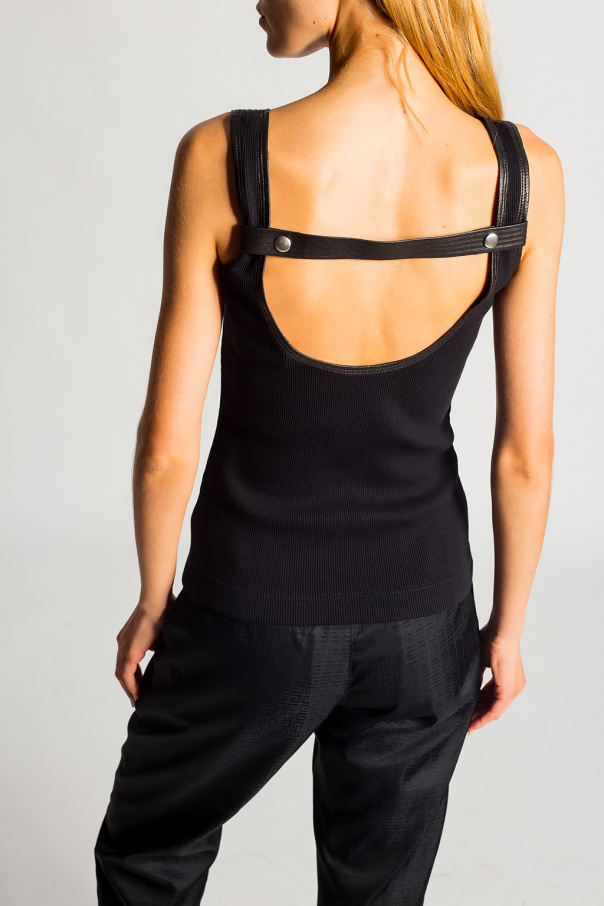 Black slip top from Givenchy. Crafted from lamb leather, this style features rib detailing and a deep cut-out back with a belt.