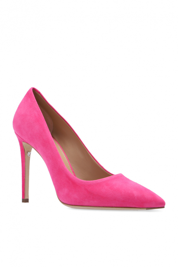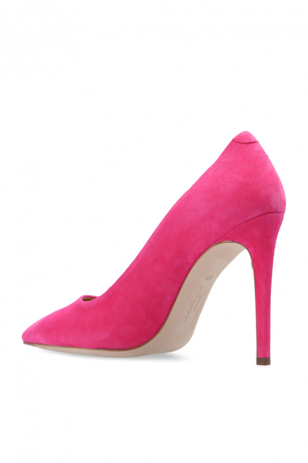 Neon pink ‘Ilary’ stiletto pumps from Salvatore Ferragamo. Made of suede produced in a sustainable way, this pointed toe pair rests on a cream leather sole.
