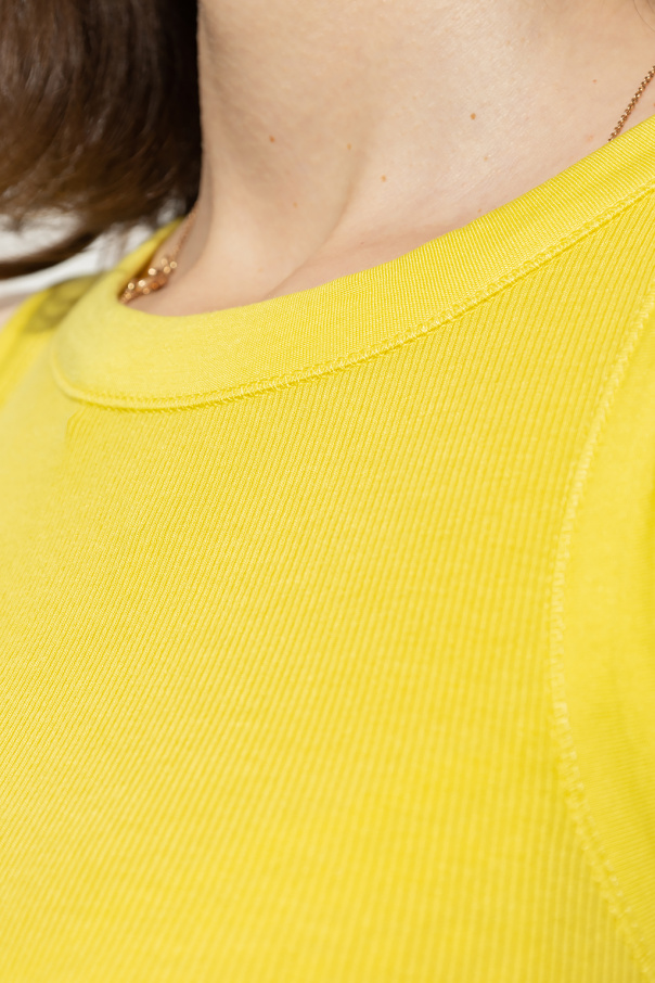 Yellow ‘Rina’ crewneck sleeveless T-shirt from AllSaints. Made from ribbed knit, this style features an elasticated collar and shoulder edges and the brand's signature Ramskull embroidery at the back.