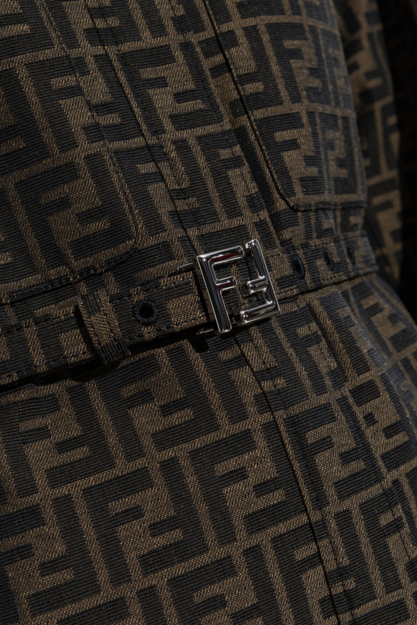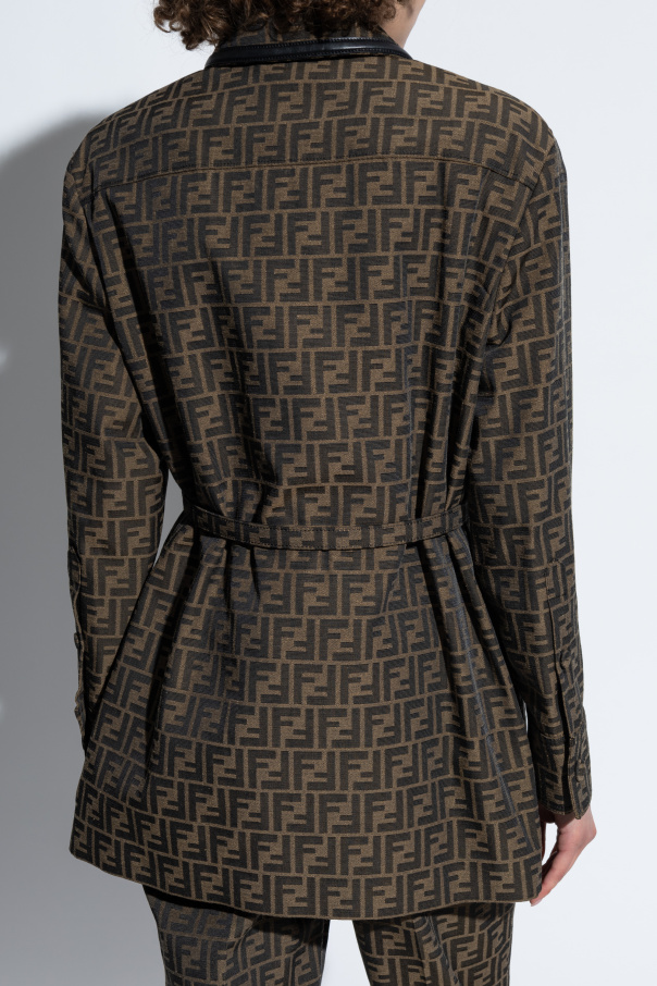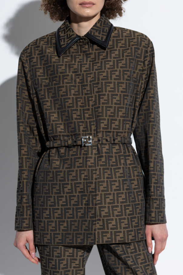 Introducing the Monogram Shirt by the illustrious house of Fendi, an epitome of sartorial elegance and timeless design. This exquisite shirt is a testament to Fendi\'s unrivaled craftsmanship and dedication to luxury fashion. The shirt boasts a classic cut adorned with long sleeves and a refined collar. The buttons are discreetly hidden beneath a sleek fabric placket, enhancing its sophisticated appearance. The distinctive double \"F\" monogram pattern graces the entirety of the high-quality fabric, a blend of polyester and cotton, ensuring both comfort and durability. Enhancing its uniqueness, the shirt includes a chic belt with a metal buckle, also featuring the iconic \"FF\" monogram, a subtle yet striking accent. The collar and cuffs are highlighted with darker trims, adding a touch of contrast and elegance. Part of an ensemble, this shirt can be paired with matching trousers to create a cohesive and fashionable look. The shirt also features two pockets and a slightly elongated back, offering a modern twist on a timeless design. Why Choose This Product? Iconic Design: The double \"F\" monogram is synonymous with Fendi\'s luxurious heritage. High-Quality Material: A blend of polyester and cotton ensures comfort and durability. Elegant Details: Hidden buttons, a monogrammed belt, and contrasting trims exude sophistication. Versatile Fashion: Can be paired with matching trousers for a complete, stylish outfit. Renowned Brand: Crafted by Fendi, celebrated for its innovative and trendsetting designs.