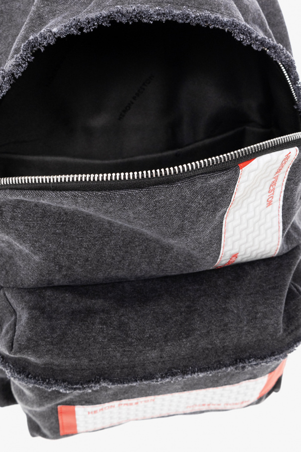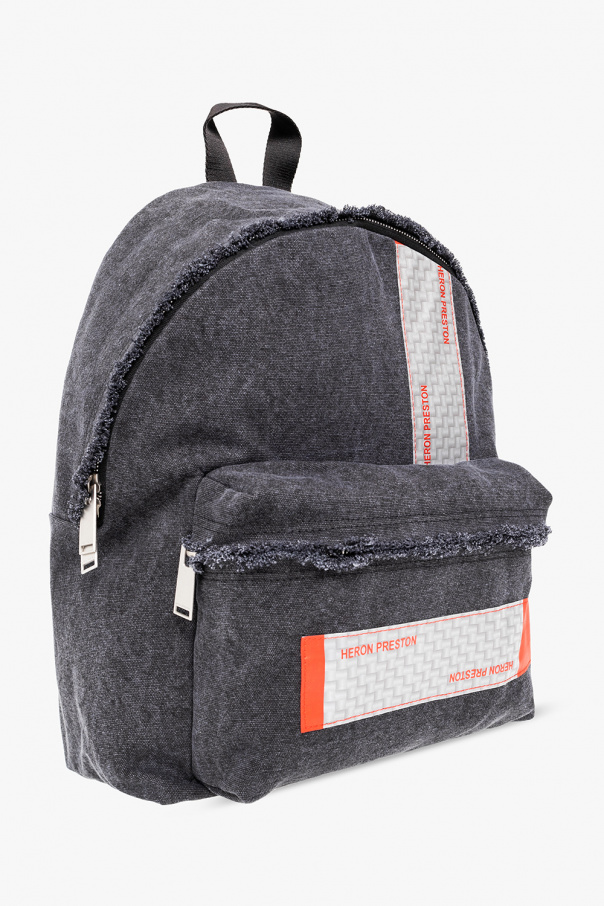 Grey backpack from Heron Preston. Made of cotton. Fastened with a two-way zip, this garment features a grey and red logo patch, front zip pocket, half-round handle, adjustable shoulder straps, raw cut edges and one internal compartment with one slip pocket.