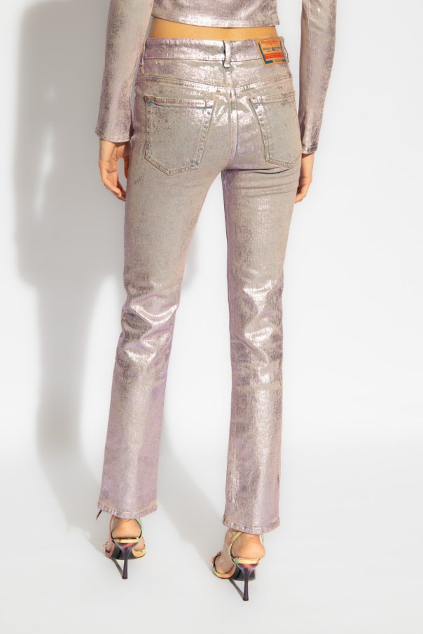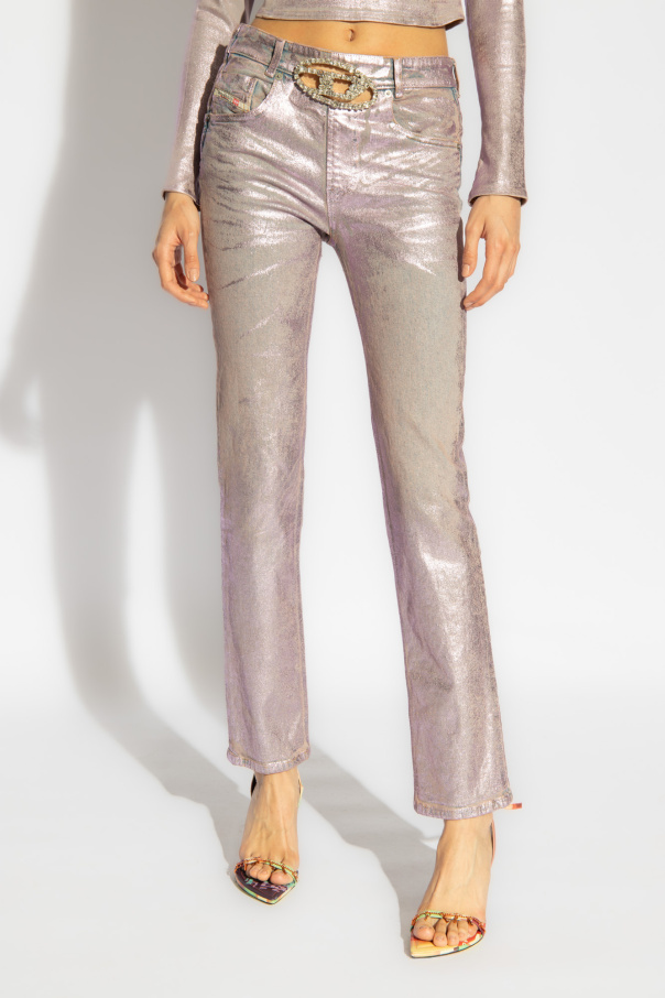 Purple and blue ‘1989 D-MINE-D-FSE’ jeans from Diesel. Fastened with a side zip, this design features a metallic finish, logo-shaped buckle in silver-tone metal embellished with crystals, two logo patches and five slip pockets.