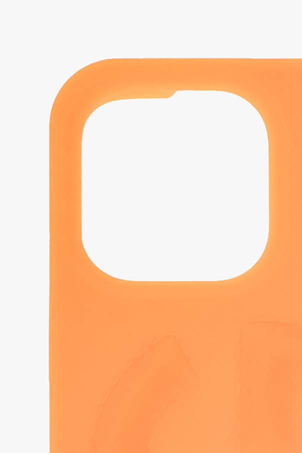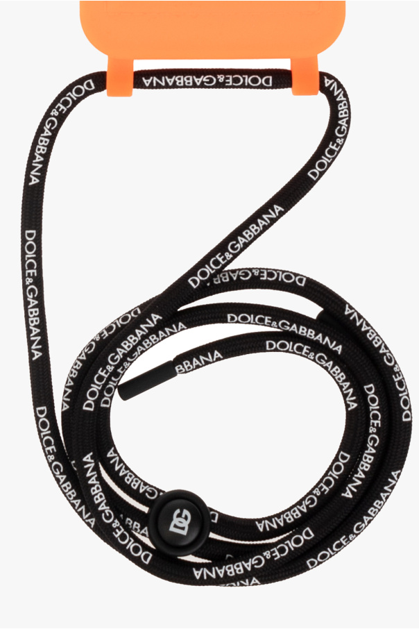 Neon orange iPhone 13 Pro case from Dolce & Gabbana. This item is decorated with a raised monogram and black adjustable strap with a white logo.