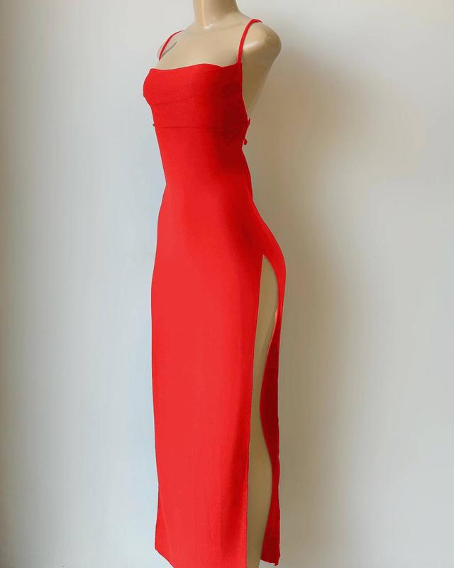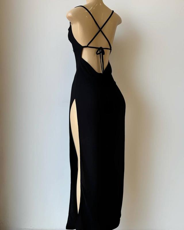 Волнительные открытая спинка, хрупкая талия и разрез, удлиняющий ножки - подчеркивают женственные линии тела.
