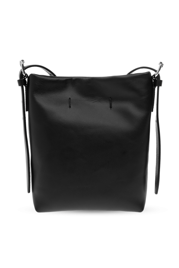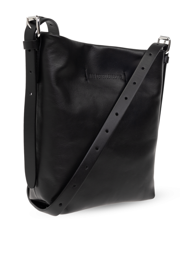 Black shoulder bag from Ann Demeulemeester. Made of calf leather, this model fastens with a magnetic snap and features an embossed logo, shoulder strap, silver-tone metal hardware and one internal compartment with one slip pocket.