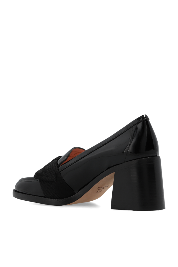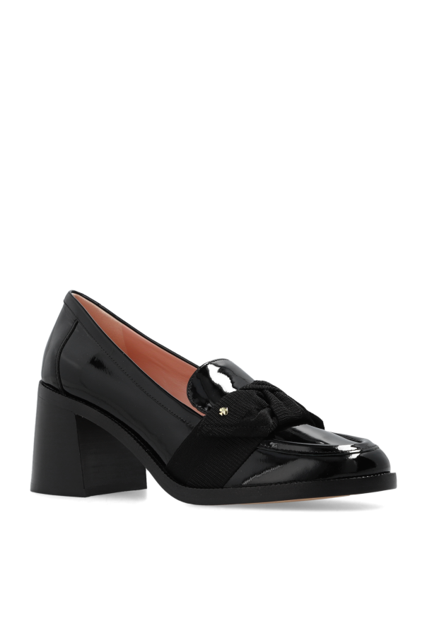 Black ‘Leandra’ pumps from Kate Spade. Made of patent leather with a round toe, this model sits on a beige leather sole and features a black bow with a gold-tone logo.